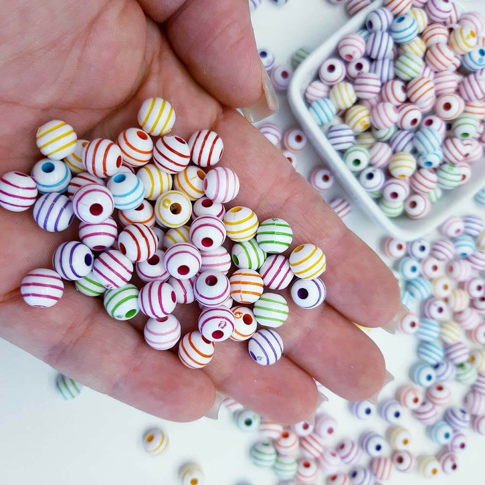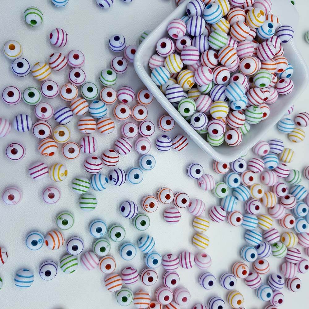 Miçanga Bola Frizada branca listada colorida 8mm 100 unidade